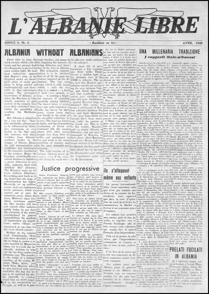 But Albania is inhabited by a race not Slav, therefore unreliable, always easy to be influenced by ideologies extraneous or even hostile to the Slav soul, this immense soul which stretches from Albania’s northern border to the steppes of Siberia. Hence the ferocious, scientifically conceived decision to liquidate as many Albanians as possible, replacing them with faithful Slav elements. The Russians want an Albania without Albanians. Everything now leads us to the belief that the stage of extermination has begun. Hurriedly set up political courts deal out continuous death sentences, which are carried out at once. In mountain areas, where the fierce Malissori clans live, where resistance against the Slav invader still has epic aspects (that unfortunately today do not draw the attention of the world, overwhelmed by general insensibility), the methods of suppression are expeditious; entire villages are massacred at one time for the most absurd reasons.