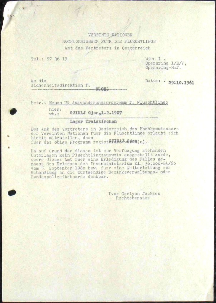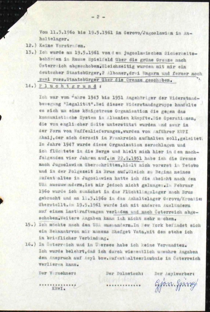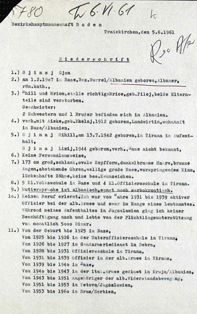 On May 19, 1961 he was deported by the Yugoslav security authority across the border to Austria in the Spielfeld area. His reason for fleeing Albania in his own words: 1“From 1943 to 1951 I was a member of the resistance movement “Legalitat”. This resistance group was a royalist organization that fought against the communist system in Albania. The operations, which were supported by the British in the form of arms shipments, were led by Kupi Ahaij, who is currently believed to be in France. In 1947, this organization was dismantled and I fled to the mountains, where I remained for the next four years. On September 22, 1951, I crossed the border into Yugoslavia, I intended to emigrate to the USA, but I was unsuccessful. In February 1960, I was first taken to the refugee camp in Brus and on March 11, 1960, transferred to the detention Camp in Gerovo, Croatia. On may 19, 1961, I was loaded onto a truck with other foreigners and deported to Austria. I cannot provide any further information. I would like to go to the USA. I have an acquaintance in New York named Shefget Vata, with whom I correspond. I have no relatives in Austria or overseas. I have been informed that knowingly providing false information could result in the loss of my right to asylum or residence permit in Austria.” Baden District Authority, Traiekirchen, June 5, 1961