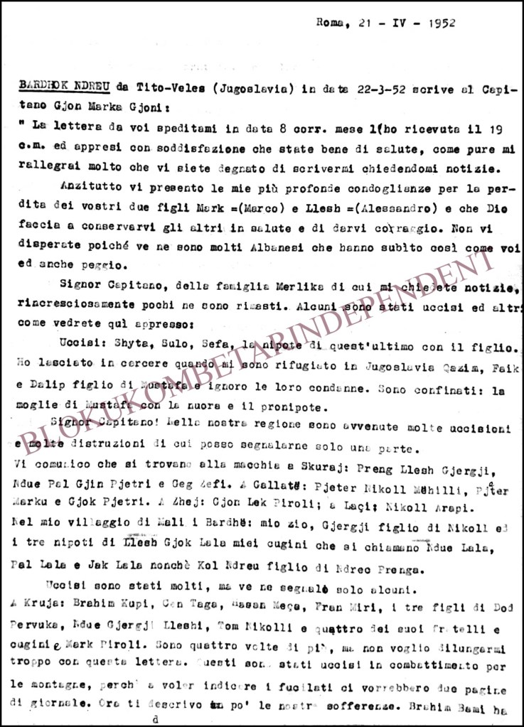 Bardhok Ndreu from Tito-Veles (Yugoslavia) on 22-3-52 writes to Kapidan Gjon Marka Gjoni: