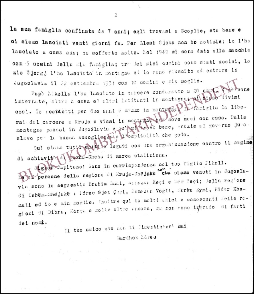 Now I will describe to you a little of our suffering. Brahim Bami and his family were interned for 7 years; I found him in Shokpje and he is well, I left him 20 days ago. For Llesh Gjoka I have no news, I left him at his home, he suffered a lot. In 1949 I went on the run with 5 men from my family; among my cousins, many were killed, my uncle Gjergj I left in the mountains and I was able to enter Jugoslavia on the 22 September 1951 with 10 men and my wife.