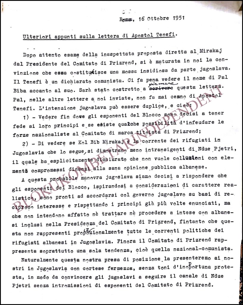 To this probable Yugoslav maneuver we are determined to respond that the exponents of the Bloc, inspired by realistic considerations, are ready to reach an agreement with the Yugoslav government on the basis of mutual interest and respecting the principles already stated several times, but that they do not intend at all to deal with or proceed to agreements with Albanians included in the Presidency of the Prizrend Committee, until this does not proportionally represent all the political currents of the Albanian refugees in Yugoslavia. Up to now the Prizrend Committee represents above all one tendency, that is the national-communist one.
