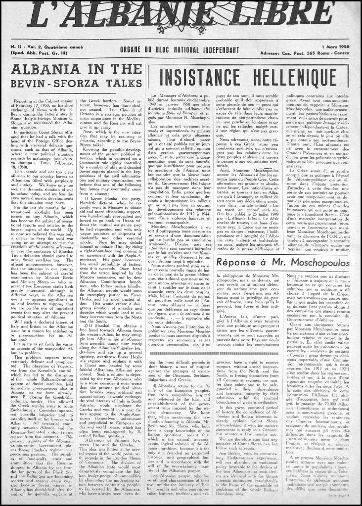 Albania’s return to the family of the European peoples, free from compulsion inspired and bolstered by the East, and re-establishment of the government rules inspired by the western democracy. We hope that, when mentioning the new situation looming in Albania, Mr. Bevin and Mr. Sforza, who both have a deep knowledge of the Balkan questions, meant this, which is the natural, advantageous, logical solution of the Albanian problem, because it is the only one founded on perpetual historical and geographical factors and in accordance with the will of the overwhelming majority of the Albanian people.