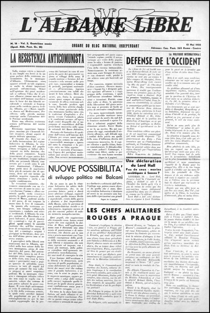 The Albanians, both those wandering on the hard roads of exile and those who await the day of liberation in the oppressed homeland, will not throw the size of their forces into the anti-Communist struggle, modest perhaps, but certainly decided and devoted to extreme sacrifice, unless they will first obtain from the Western powers the official recognition of their country’s independence and the integrity of the national territory.