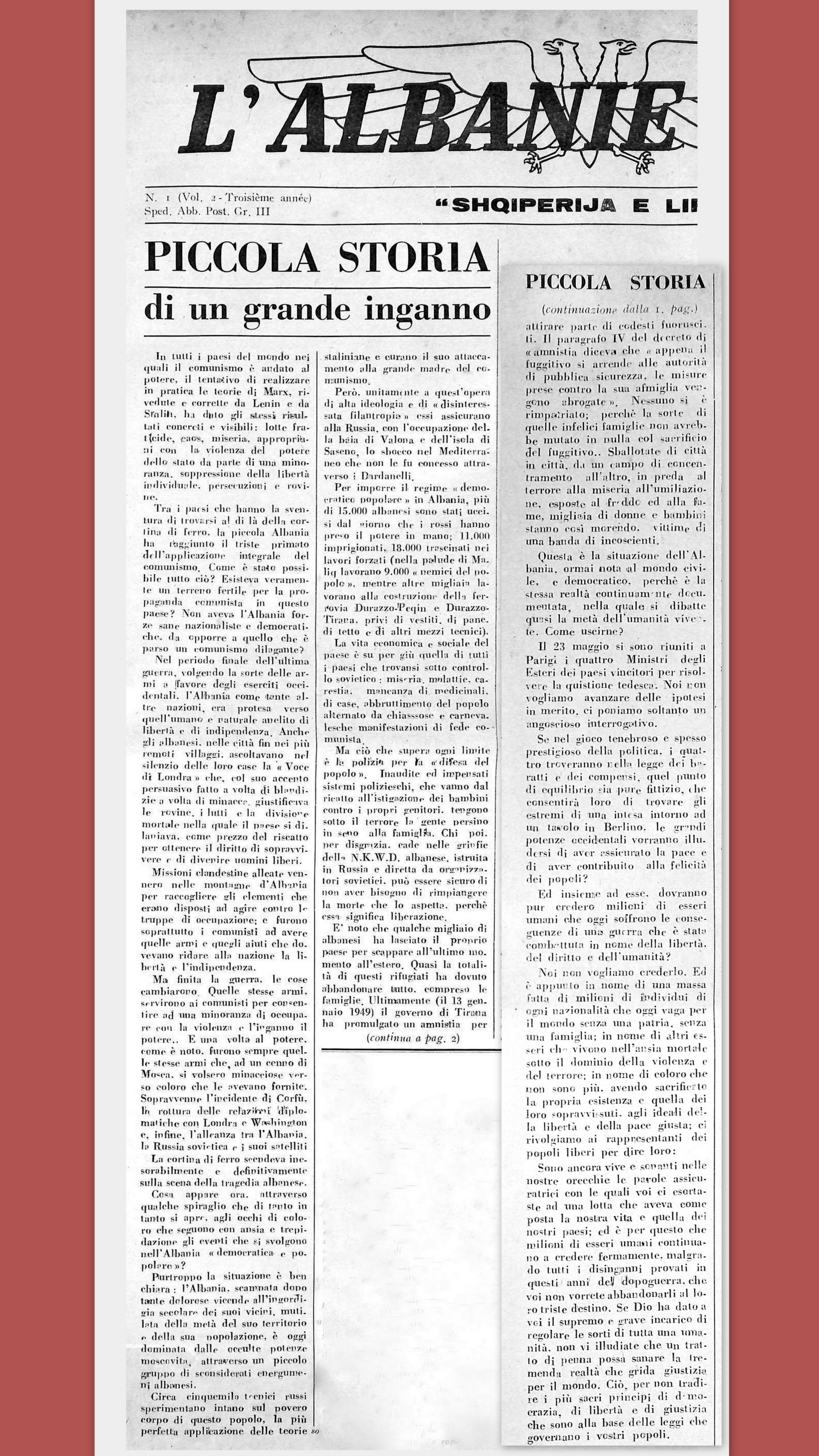 But after the war, things changed. Those same weapons were used by the communists to allow a minority to occupy power with violence and deception. And once in power, as is well known, it was always those same weapons that, with a sign from Moscow, turned threateningly towards those who had supplied them. The Corfu incident occurred. The breaking of diplomatic relations with London and Washington and, finally, the alliance between Albania, Soviet Russia and its satellites.