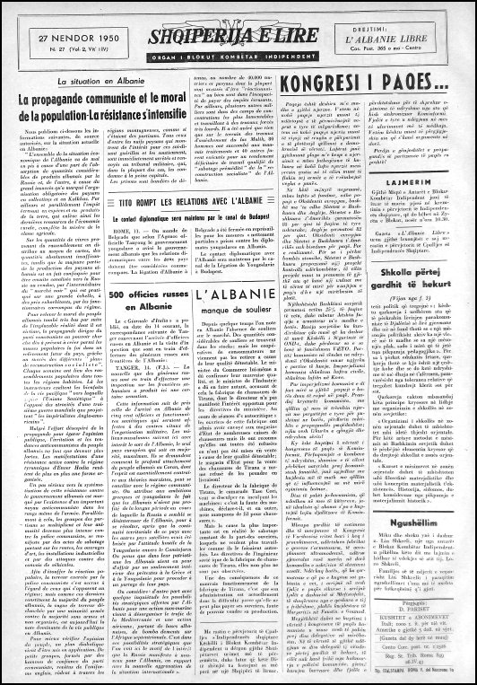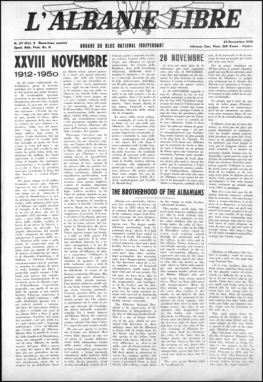 This Mother needs help. She needs help from her children who are able to work without hindrance in free countries, to save her other children who are suffering under the yoke of slavery. Once upon a time on the 28th of November, voices raised in song and rejoicing echoed through the mountains and in the valleys, in the cities and in the villages. Today, however, an exceedingly moving and tormented appeal re-echoes in the silence surrounding Albania, so oppressed and torn by the claws of Communism, and in the silence that fills our hearts in this exile which is filled with nostalgia and unreturned affection. The common Mother pleads with us. Mother Albania asks and waits for the help of our united forces. Where are these differences and disagreements? What do they amount to, compared with the voice that reaches to the depths of our hearts? In that voice echoes the password of our martyrs of every epoch, who sacrificed their lives to make our homes secure; the voice of our ancestors who bequeathed to us the habits and customs that make us Albanian; the voice of our most cherished poets, and the heaviest sighs of those near and dear to us; the echo of the lutes that no longer glorify the greatness of the ancient “besa”; the echo of the weeping of our sisters who have more tears to shed on the innumerable graves that have covered our land in these last six years.