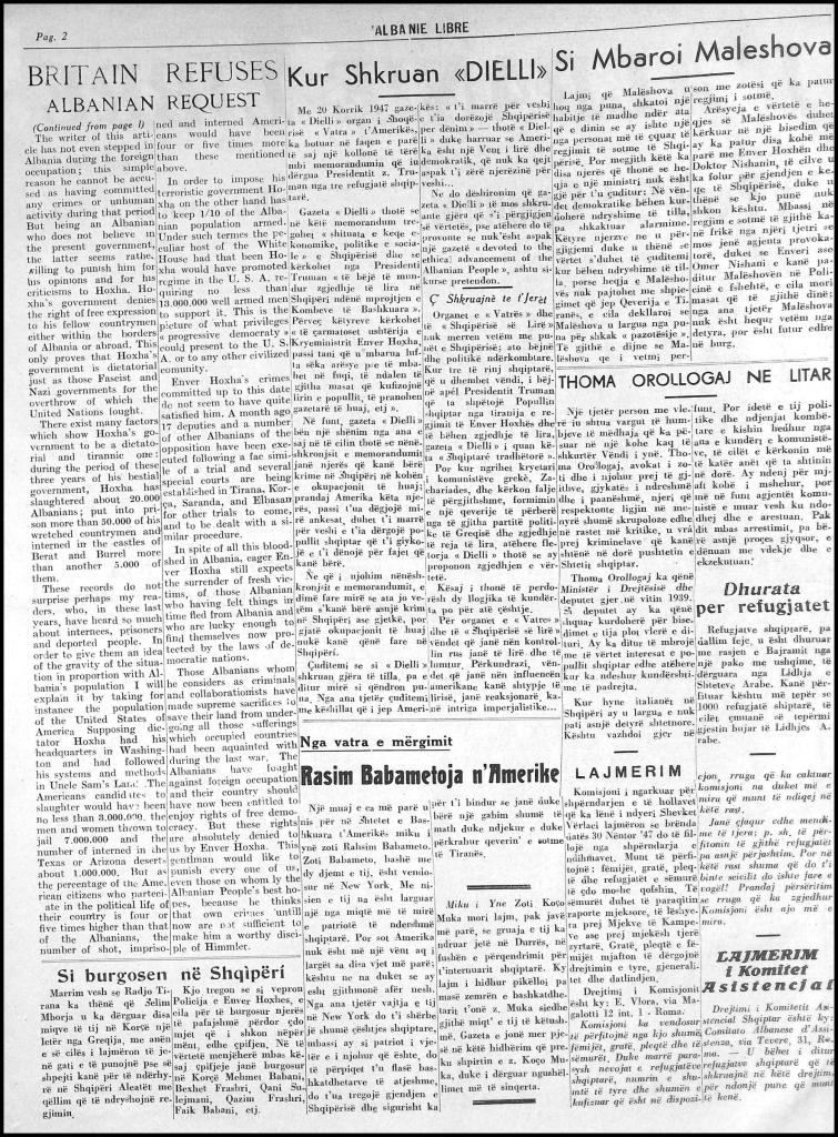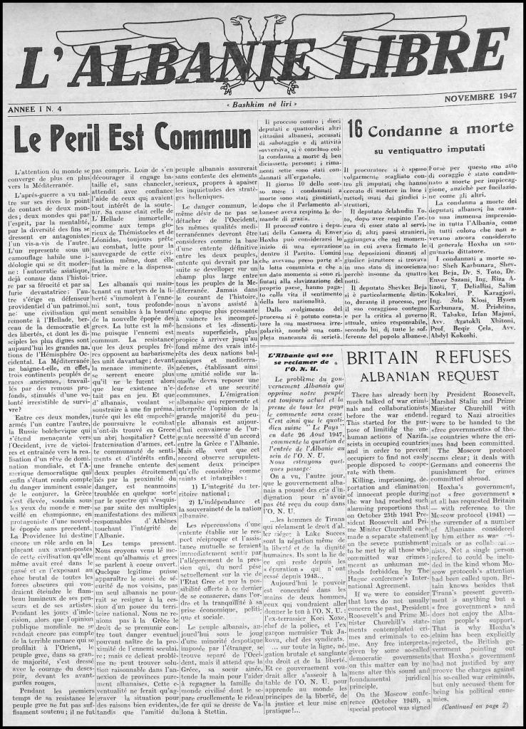 The writer of this article has not even stepped in Albania during the foreign occupation; for this simple reason he cannot be accused as having committed any crimes or inhumane activity during that period. But being an Albanian who does not believe in the present government, the latter seems rather willing to punish him for his opinions and for his criticism to Hoxha. Hoxha’s government denies the right of free expression to his fellow countrymen whether within the borders of Albania or abroad. This only proves that Hoxha’s government is dictatorial just as those Fascist and Nazi governments for the overthrow of which the United Nations fought.